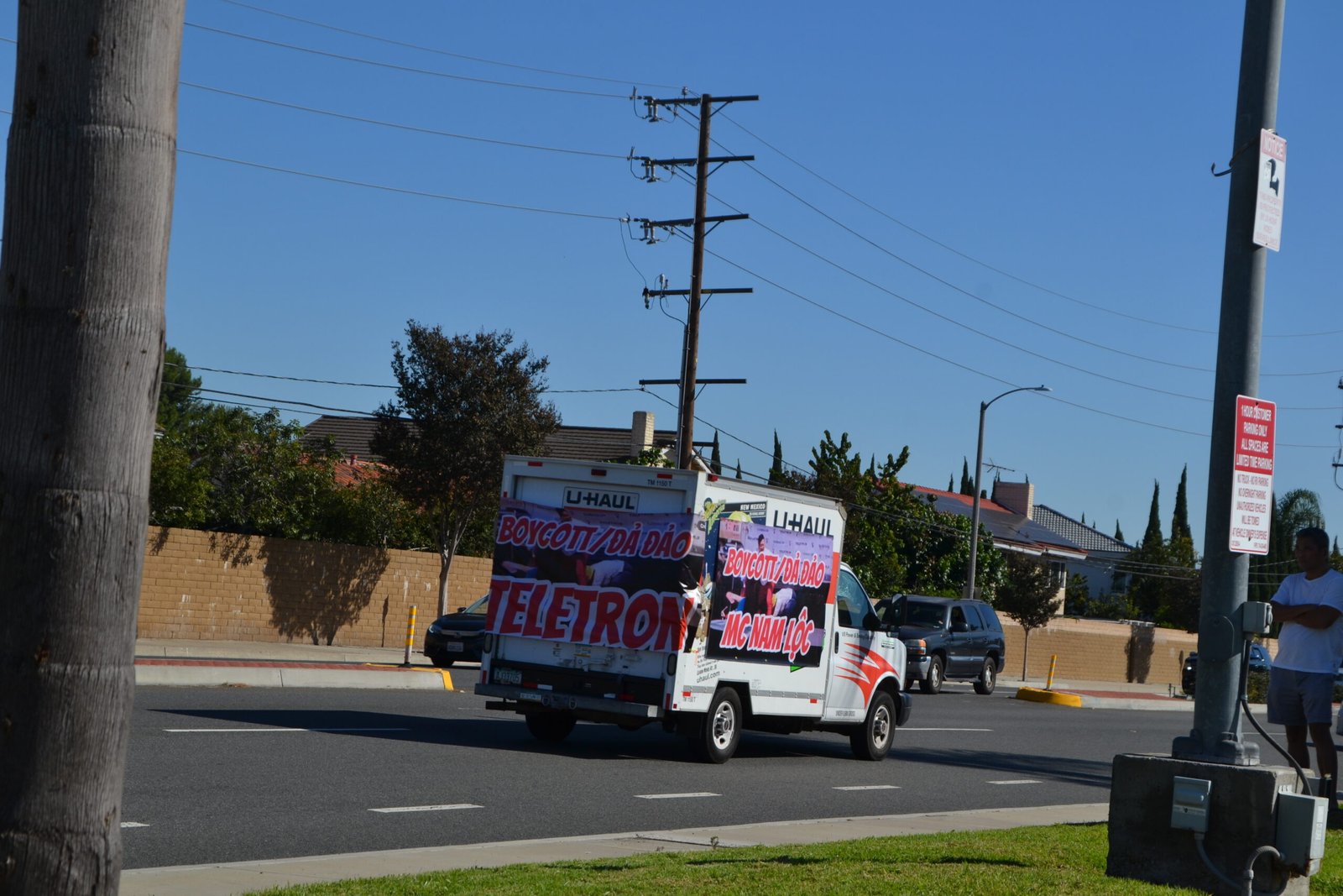 Nhưng trong lúc đoàn biểu tình đang chuẩn bị chỉ hô các khẩu hiệu trên thì bà Nhật Linh xuất hiện, bà mang từ trong xe ra một máy vi âm, tiến lại gần, đối diện đoàn biểu tình và bắt đầu cầm micro mở hết công xuất thóa mạ đoàn biểu tình , bà luôn miệng nói” “Đây là bọn phá hoại cộng đồng – Đây là bọn tàn quân chuyên gây rối và phá hoại cộng đồng – Bùi Phát là tên Việt Cộng, Bùi Phát ngồi cùng bàn với Tổng Lãnh Sự Việt Cộng”; có lúc bà còn xúc phạm nặng lời đến cha mẹ của ông Bùi Phát. Vì những lời xúc phạm và thóa mạ đoàn biểu tình nên Ủy Ban mới xử dụng máy vi âm phản lại cái loa của bà Nhật Linh, và mới có những câu khẩu hiệu bộc phát chống lại bà Nhật Linh. Bên chống đoàn biểu tình, ngoài bà Nhật Linh còn có ông Ngô Kỷ. Ông Ngô Kỷ lái chiếc xe hơi sơn màu cờ VNCH đến đậu ngay trước cửa nhà hàng Ngự Bình. Ông bị nhiều người trong đoàn biểu tình hô to: “ Ngô Kỷ vì ham tô bún bò Ngự Bình mà bỏ Cờ Vàng”, Đả đảo Nhật Linh tiếp tay cho Nguyễn Tiến Dũng, Tẩy chay Ngự Bình tiếp tay cho Teletron”. Phía đoàn biểu tình có khá đông đồng hương tay cầm Cờ Vàng và biểu ngữ với 8 nội dung như đã đề câp ở trên, nhiều phóng viên báo chí và truyền hình có mặt. Lúc 10 giờ 30, Cảnh Sát yêu cầu bà Nhật Linh phải lui vào phía trong cách xa đoàn biểu tình vì bà không có giấy phép. Bà Nhật Linh kéo máy vi âm vào trong gần quán Ngự Bình và tiếng nói của bà đã nhỏ dần so với loa phóng thanh của đoàn biểu tình, đặc biệt nhiều xe qua lại ngang chỗ biểu tình đều bóp còi biểu đồng tình, một chiếc xe U Haul , bên hông xe có hàng chữ rất lớn “Boycott/Đả đảo MC Nam Lộc”. Phía sau có hàng chữ “Boycott/Đả Đảo Teletron”. Xe chạy tới chạy lui nhiều lần trên đường Edinger, đòan biểu tình hô vang các khẩu hiệu và đến 11 giờ 30, sau lời cám ơn của ban tổ chức, đoàn biểu tình giải tán trong trật tự./.