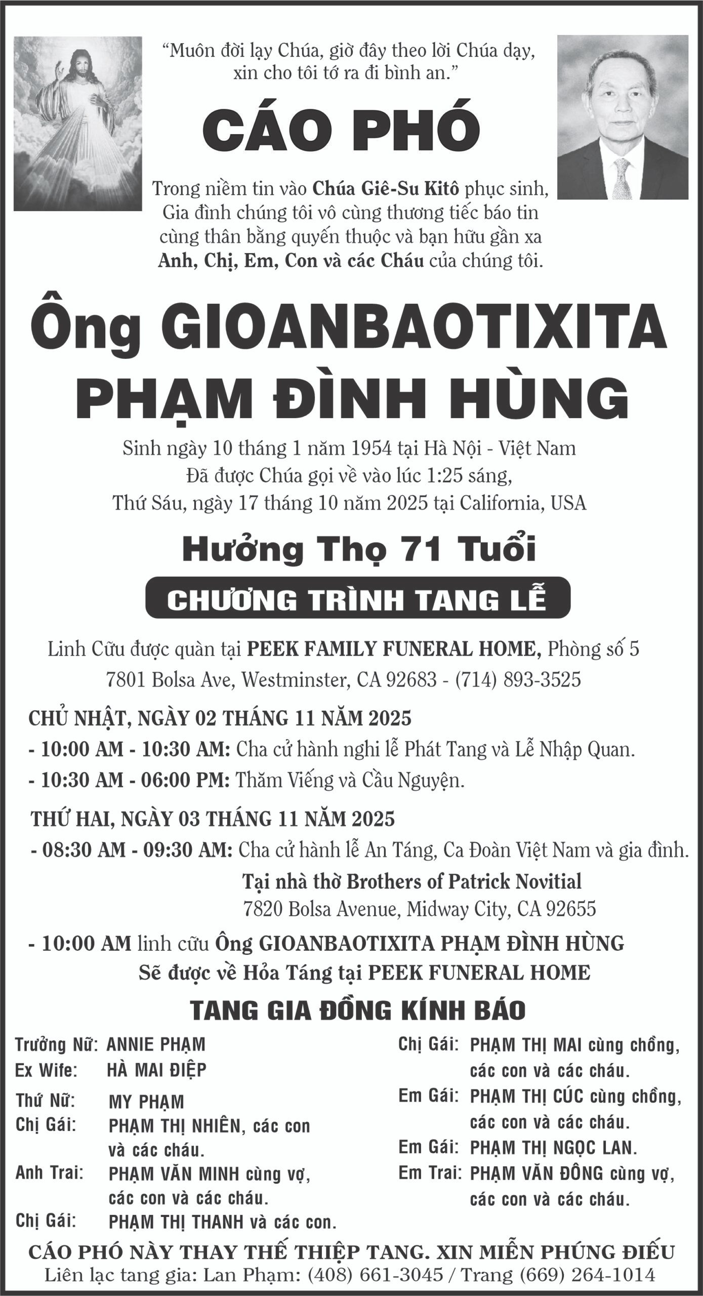 Cáo Phó - Phân ƯuCÁO PHÓ: ÔNG PHẠM ĐÌNH HÙNG Posted on October 29, 2025 by T Nguyen T Nguyen CHƯƠNG TRÌNH TỪ THIỆN TẠI CHÂU PHI NĂM 2025 DO CHÙA HƯƠNG SEN TỔ CHỨC PHÂN ƯU: ÔNG DOÃN QUỐC SỸ