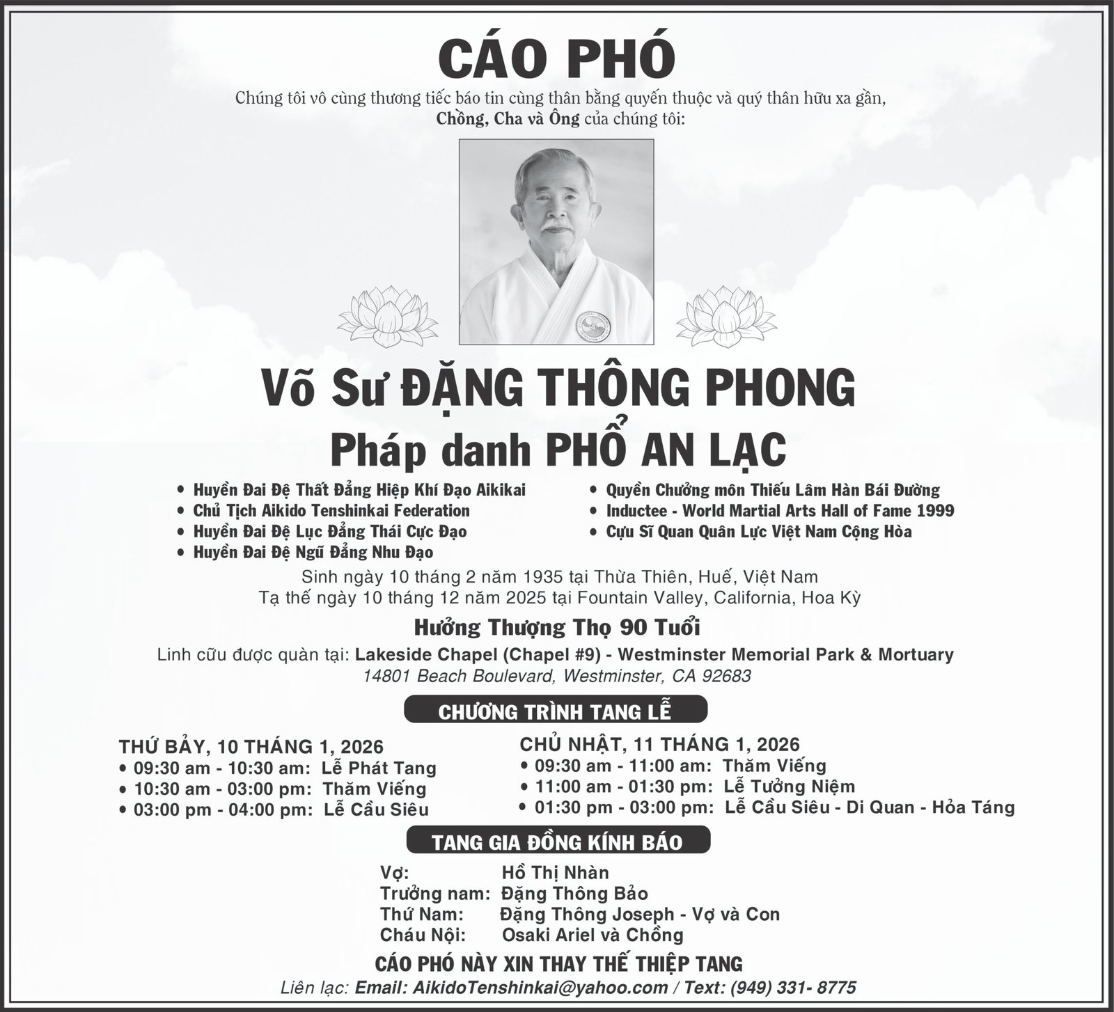 Cáo Phó - Phân ƯuCÁO PHÓ: VÕ SƯ ĐẶNG THÔNG PHONG Posted on December 30, 2025 by T Nguyen T Nguyen Chùa Huệ Quang Tổ Chức Lễ Hiệp Kỵ Tưởng Niệm Ân Sư