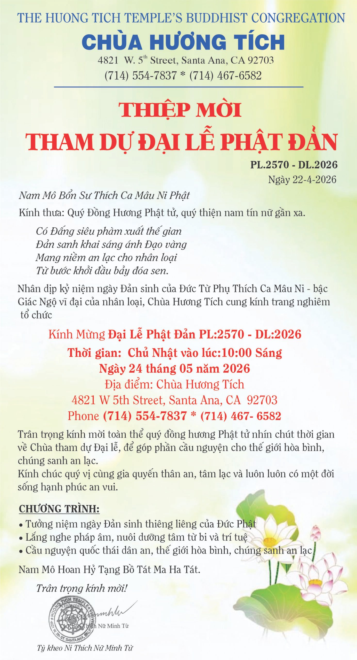 Chùa Hương Tích: Thư Mời Tham Dự Đại Lễ Phật Đản