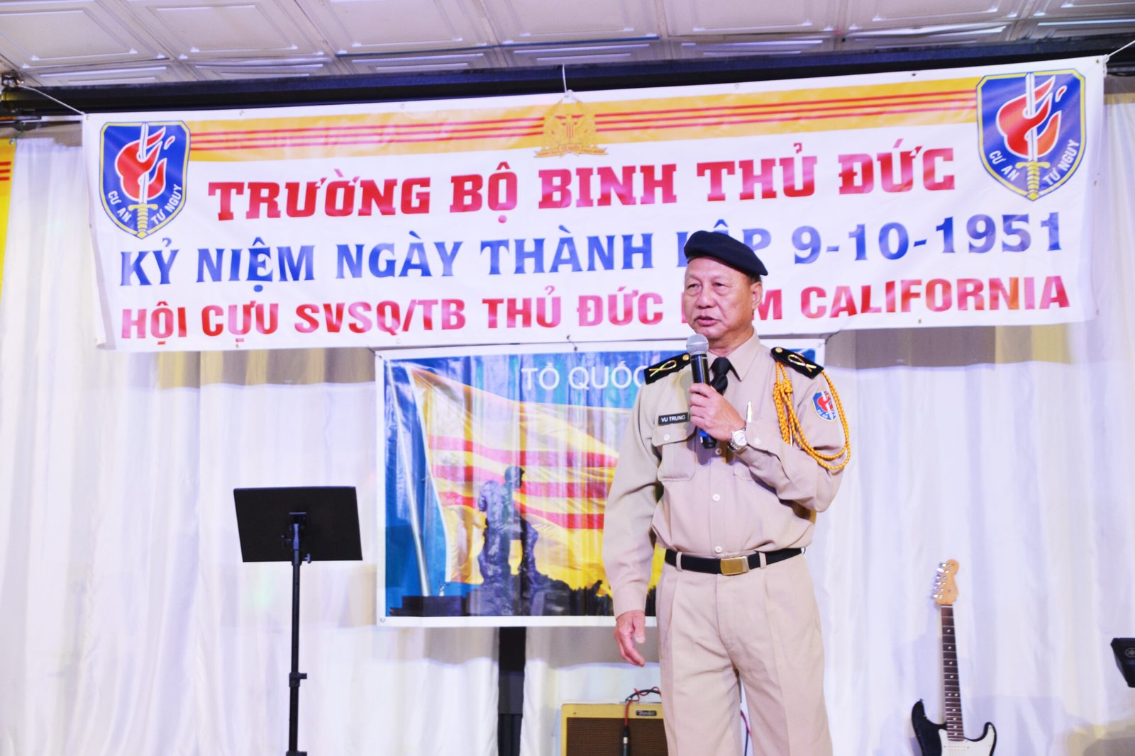 Sau nghi thức Truy Điệu đầy xúc động, Trưởng Ban Tổ Chức giới thiệu cựu SVSQ Vũ Đình Trung, Hội Trưởng Hội Ái Hữu cựu SVSQ Trừ Bị Thủ Đức Nam Califrnia đọc diễn văn chào mừng: “..Trường Bộ Binh Thủ Đức đã được thành lập từ ngày 9 tháng 10, 1951 tại đồi Tăng Nhơn Phú, Thủ Đức. Chỉ Huy Trưởng cuối cùng là niên trưởng Đại tá Trần Đức Minh (Khóa 1 Nam Định). Những ai đã từng là SVSQ trường Bộ Binh không làm sao quên được những tuần lễ đầu tiên “Huấn Nhục” cam go, gian khổ với những bài học chiến thuật trên đồi 18, đồi 30 và giây tử thần trên hồ Lệ Thủy, chiều di hành rời cổng số 9 đi qua xã Linh Xuân Thôn mùi hoa bưởi, hoa nhài thoang thoảng và biết bao những vất vả khi đến được trước cửa nhà bàn sắp hàng vào ăn cơm chiều. Trường BB Thủ Đức đã đào tạo được hai danh Tướng lưu danh muôn thuở là Thiều Tướng Nguyễn Khoa Nam (Khóa 3), Tư Lệnh Sư Đoàn 7 của tôi và sau này là Tư lệnh Quân Đoàn 4, và Chuẩn Tướng Lê Văn Hưng (khóa 5) đã tuẫn tiết ngày 30 tháng Tư, 1975 được “Vinh Danh Muôn Thuở” và làm rạng danh trường BB Thủ Đức nói riêng và các sĩ quan Trường BB Thủ Đức nói chung… Hội Trưởng Hội Ái Hữu Cựu SVSQ Trường BB Thủ Đức sau đó nói rằng tất cả cựu SVSQ Thủ Đức này đã già, đã qua tuổi “Thất Thập Cổ Lai Hy” nhưng mỗi khi nhắc lại những tấm gương hy sinh vô cùng anh dũng của các cưu SVSQ như Trung Úy Hảo (Khóa 1/70) 11 giờ sáng 30/4/1975 khi nghe tin hàng tướng Dương Văn Minh đầu hàng Cộng quân anh đã kê súng vào đầu tự sát, Khóa 1/72 Thiếu Úy Thái, binh chủng Nhẩy Dù, binh chủng kiệt xuất của QL/VNCH đã ngăn chận địch tại ngã tư Bảy Hiền . Sau khi chiến đấu đến viên đạn cuối cùng, ông đã cùng 6 người lính Dù khác ôm nhau rút chốt lựu đạn để cùng hy sinh tại ngã tư Bảy Hiền, làm dân cư tại đây vô cùng thán phục và kính nể. Ông cũng cho biết mỗi khi nhắc đến khẩu hiệu “Cư An Tư Nguy” tất cả các cựu SVSQ Trừ Bị Thủ Đức đều cảm thấy vui mừng và hãnh diện là sĩ quan của Quân Lực VNCH, xuất thân từ trường BB Thủ Đức KBC 4100 mà anh em vẫn thường nói vui “Bốn thằng một mâm”. Sau cùng chiến hữu Hội Trưởng chúc qúy vị một bữa ăn ngon bên gia đình, bạn bè và người thân.