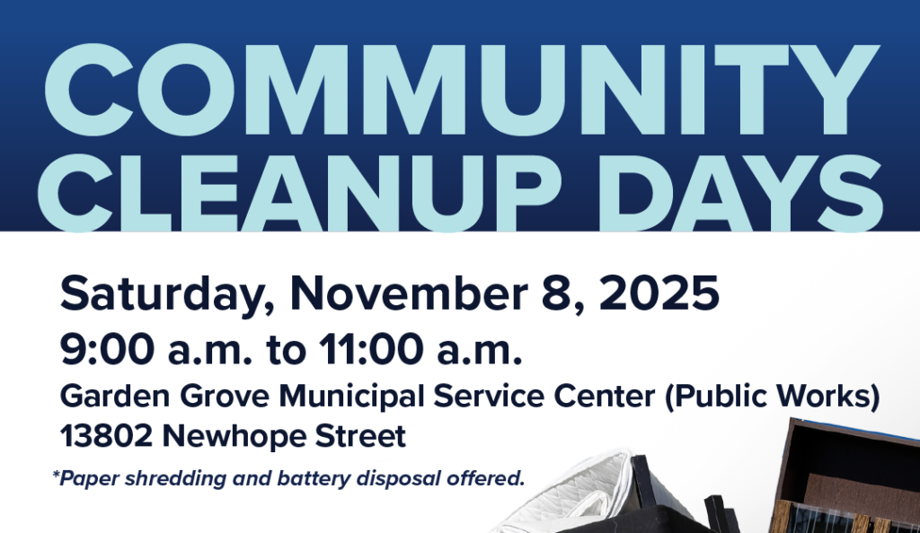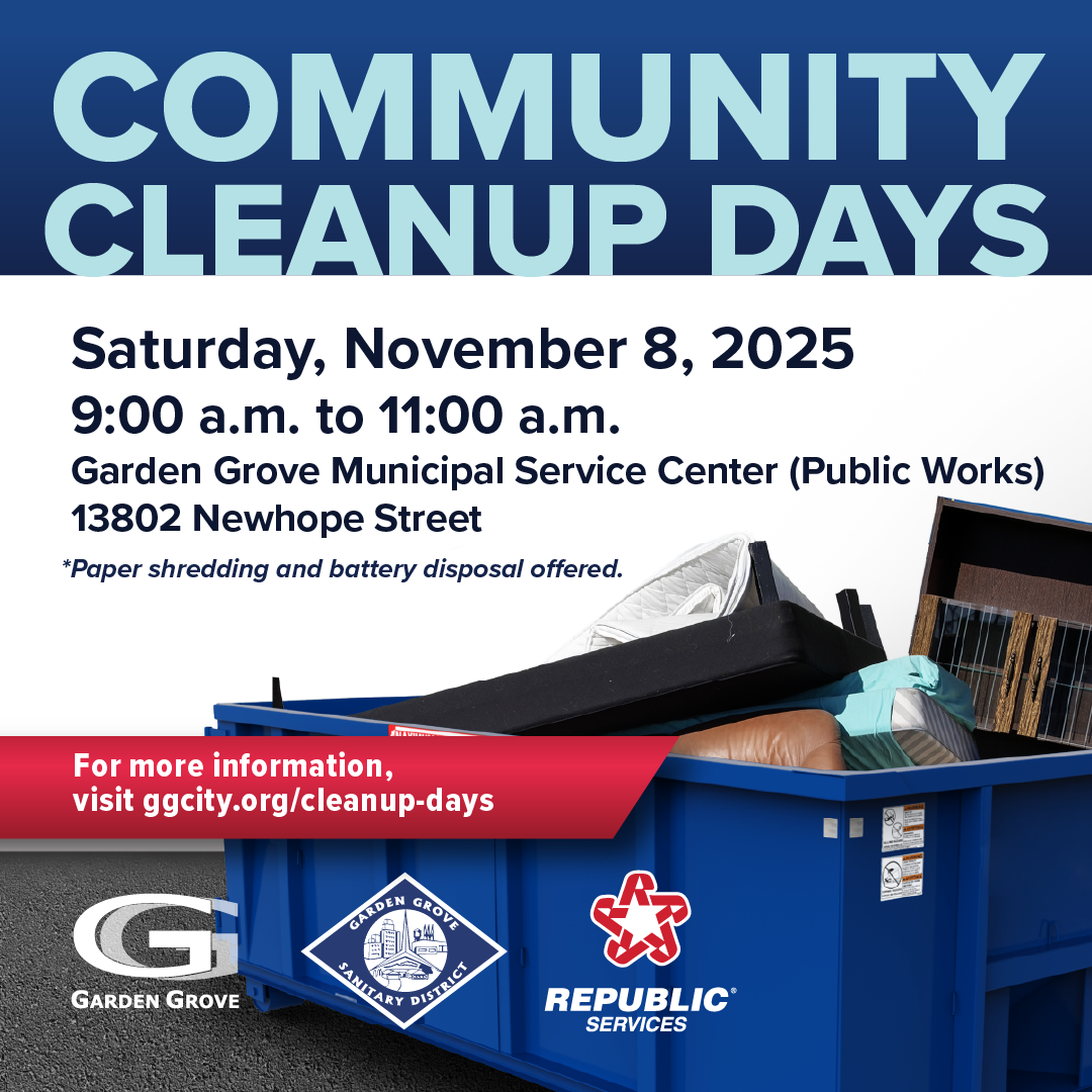 Vào sáng Thứ Bảy, ngày 8 tháng 11, từ 9:00 giờ sáng đến 11:00 giờ trưa, Thành phố Garden Grove hợp tác với Garden Grove Sanitary District & Republic Services, tổ chức một ngày dọn dẹp cộng đồng (Community Cleanup day) để cư dân mang bỏ những đồ cồng kềnh (bulky item) miễn phí đúng cách. Sự kiện này chỉ dành cho cư dân Garden Grove và tổ chức tại Garden Grove Public Works, địa chỉ 13802 Newhope Street.
