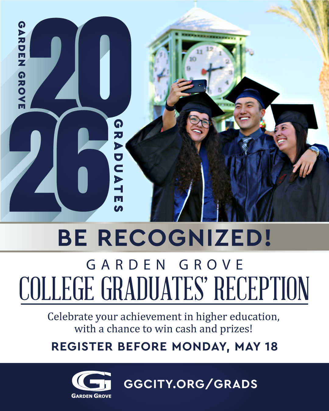 GARDEN GROVE – Thành phố Garden Grove sẽ tổ chức chương trình “Garden Grove College Graduates’ Reception” nhằm vinh danh các sinh viên đại học cư ngụ tại địa phương với những thành tích học tập nổi bật trong năm 2026.
