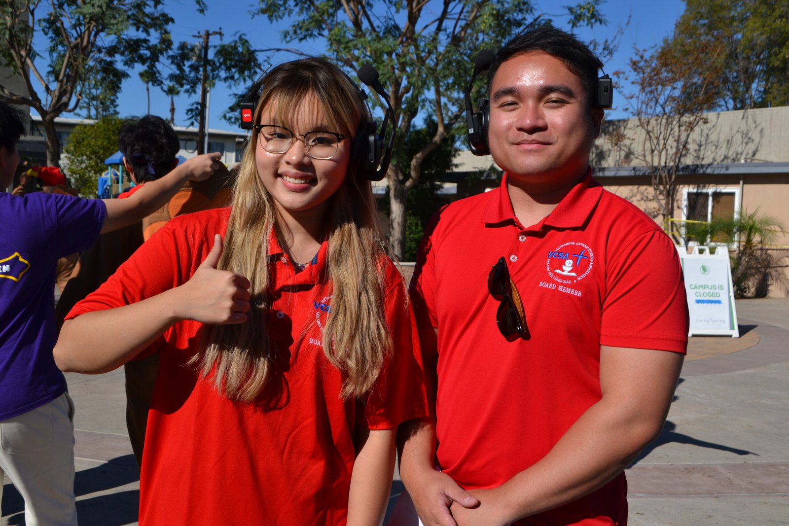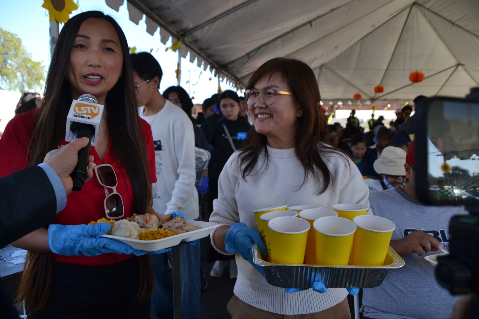 Anh Trí Trần,Trưởng Ban Tổ Chức và Sinh viên Hoàng Lợi Lợi phụ trách về truyền thông, trả lời câu hỏi của chúng tôi, cả hai sinh viên cho biết: “Năm nay có sự thay đổi địa điểm, vì chỗ hàng năm Hội vẫn làm năm nay họ không cho nữa, nên chúng con phải tìm địa điểm mới là nhà thờ Tin Lành do Mục Sư Jhon làm Quản Nhiệm. Mục sư hết lòng giúp đỡ. Tuy nhiên, vì tổ chức ngoài trời nên chúng con phải lo thuê dựng lều, sân khấu, bàn ghế v.v..cho khoảng 300 người vô gia cư, chúng con cũng phải đi shopping mua những thức ăn về nấu nướng. Ngoài Gà Tây là món chính, chúng con có nhiều món do các sinh viên tự tay chế biến rất ngon miệng. Tuy rất tốn kém nhưng chúng con đều cảm thấy vui vì đã làm cho những người kém may mắn có được niềm vui trong ngày Lễ Tạ Ơn.. Để làm công việc này Hội chúng con đã chuẩn bị từ một tháng trước, chúng con phổ biến trên các mạng truyền thông và truyền thông Công Giáo để xin các nhà hảo tâm những món quà tặng cũng như thực phẩm mà chúng con cần.. Chúng con có một trở ngại là những người vô gia cư họ không tụ tập chung một chỗ mà ở rải rác nên kiếm họ cũng khó, nên chúng con phải rải flyer kêu gọi họ tập trung ở một vài địa điểm rồi chúng con đưa xe bus đến đón. Linh mục Bill Cao, vì bận công việc của một cha chánh xứ giáo xứ Saint Anthony Claret, Anaheim, nhưng năm nào cha cũng tích cực cùng với cha Tạ Anh Kiệt giúp Hội SVCG duy trì truyền thống giúp đỡ người vô gia cư, kém may mắn bằng cách quyên góp các vận dụng cần thiết như túi ngủi, áo ấm, thực phẩm để giúp cho họ vì mùa Đông giá lạnh đang đến. Các bạn trẻ rất hăng hái làm công việc bác ái này”. Cựu Phó Thị Trưởng Thu Hà Nguyễn và Nghị viên Garden Grove, cô Ngọc Trần hàng năm vào dịp này hai cô đều có mặt với tư cách thiện nguyện viên, hai cô đã tự tay bưng thức ăn, nước uống đến trao cho từng người, khiến ai nấy đều hân hoan. Cựu Phó Thị Trưởng Garden Grove, cô Thu Hà Nguyễn cho biết, cô là người đã liên lạc với Mục Sư Quản Nhiệm nhà thờ Tin Lành này để xin giúp đỡ, và Mục Sư vui vẻ nhận lời.