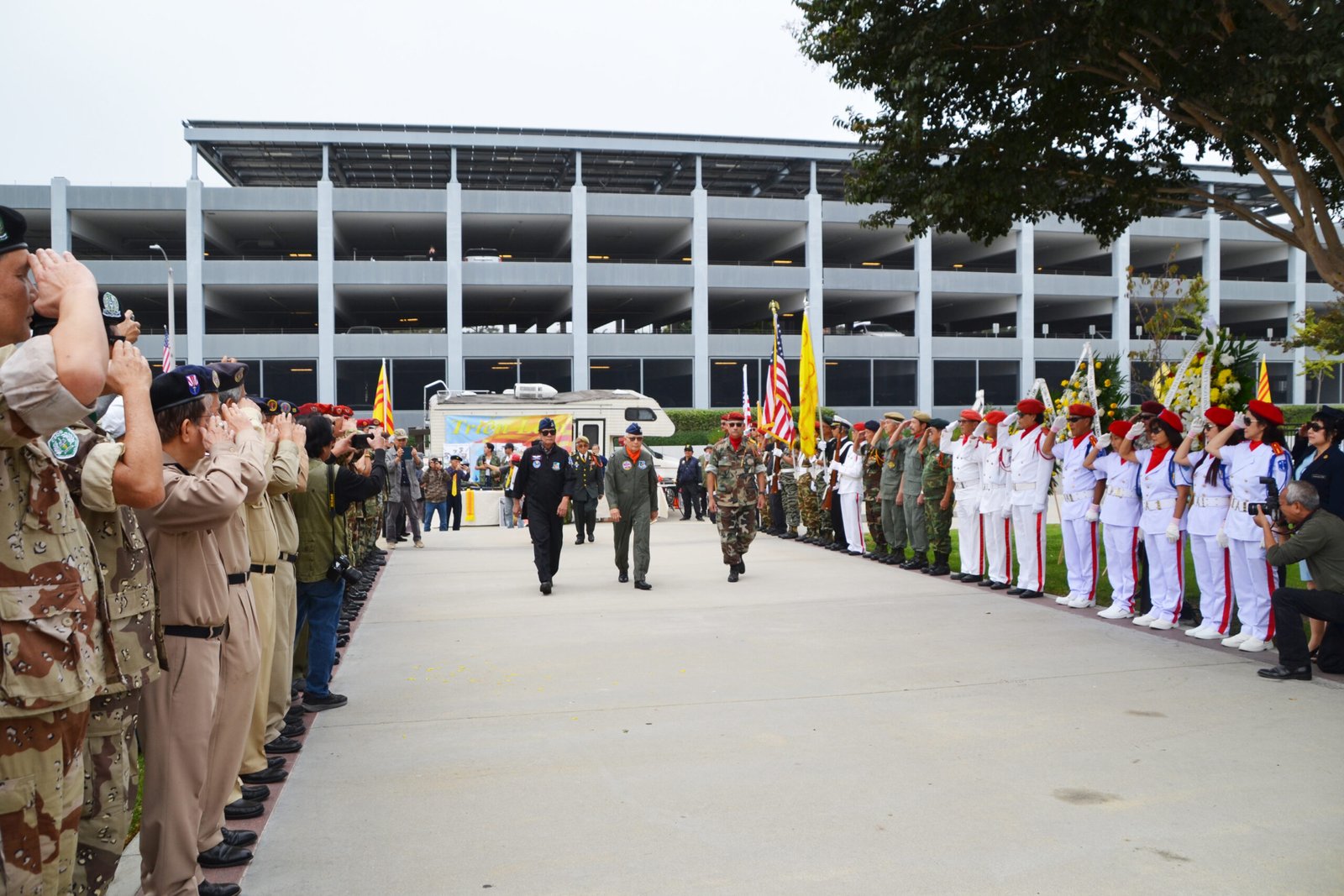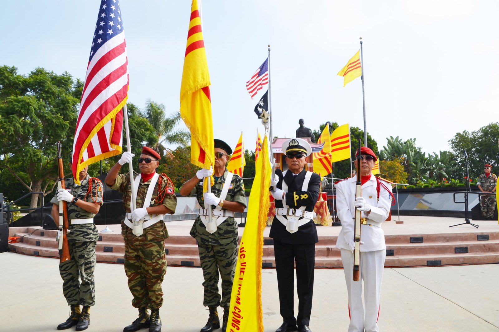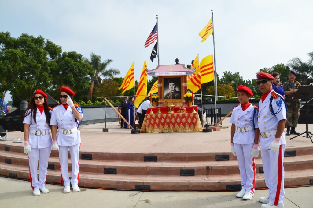 Mũ đỏ Nguyễn Văn Hùng, Chủ Tịch Liên Hội Cựu Chiến Sĩ hướng dân vị chủ tọa duyệt hàng quân danh dự. 10 giờ 45 dưới sự điều khiển của sĩ quan nghi lễ, mọi người nghiêm chỉnh đón Lệnh Kỳ và Di Ảnh cố Tổng Thống vào lễ đài. Sau khi di ảnh cố Tổng Thống an vị vào bàn thờ, nghi thức chào cờ và mặc niệm diễn ra thật trang nghiêm. Tiếp theo, hai MC Đinh Quang Truật và Diệu Quyên lần lượt giới thiệu quan khách tham dự. Về tôn giáo có ba vị trong Hội Đồng Liên Tôn gồm Linh mục Michael Mai Khải Hoàn (Công Giáo), giáo sư Nguyễn Thanh Giàu (PG Hòa Hảo) và Chánh Trị Sự Ngô Thiện Đức (Cao Đài). Ngoài ra có Linh mục Nguyễn Uy Sĩ, nguyên Giám Đốc TTCG, diễn giả của buổi lễ. Về dân cử có Dân Biểu Tiểu Bang Cali Tạ Đức Trí, Thị Trưởng Westminster Charlie Nguyễn Mạnh Chí và Phó Thị Trưởg ; ông David Nguyễn đại diện Giám Sát Viên Janet Nguyễn, LS Nguyễn Quốc Lân, bà Kimberly Hồ nguyên Phó Thị Trưởng Westminster, ông Phát Bùi, Chủ Tịch và ông Long Nguyễn, Phó Chủ Tịch Cộng Đồng Người Việt Quốc Gia Nam Cali. Các giới chức quân sự có Đại tá Lê Bá Khiếu các Trung Tá Trần Quan An, Nguyễn Văn Ức, La Trinh Tường, Võ Ý, Vũ Trọng Mục; các Thiếu Tá: Nhan Hữu Hậu, Phan Khắc Nhượng, Đặng Kim Thu, Phan Tấn Ngưu, Hoàng Đức Hậu….