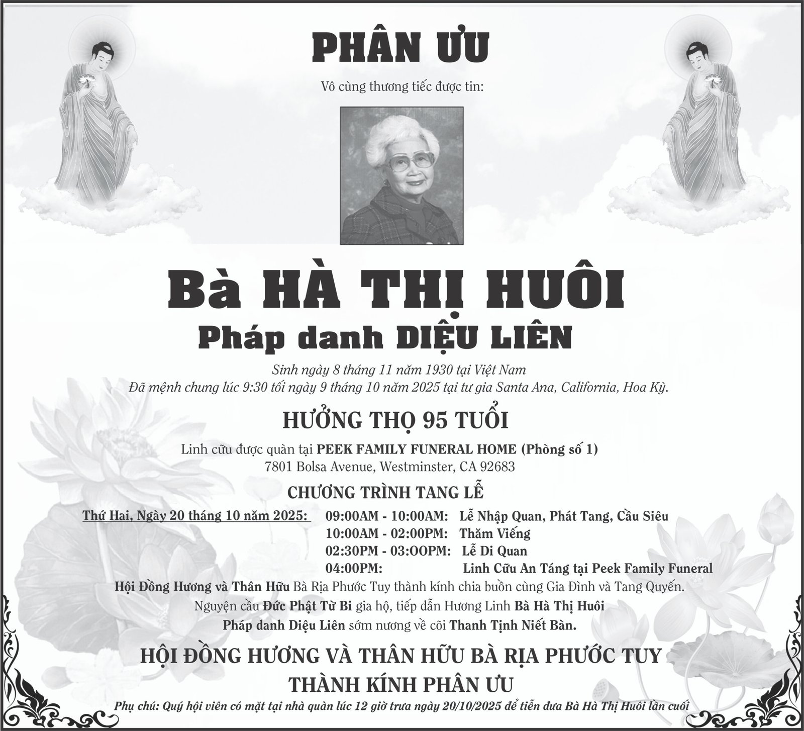 Cáo Phó - Phân ƯuPHÂN ƯU: BÀ HÀ THỊ HUÔI Posted on October 16, 2025 by T Nguyen T Nguyen ĐỨC CHA NGUYỄN CHÍ LINH VÀ CHA ĐỖ MINH TUẤN ĐẾN ORANGE COUNTY