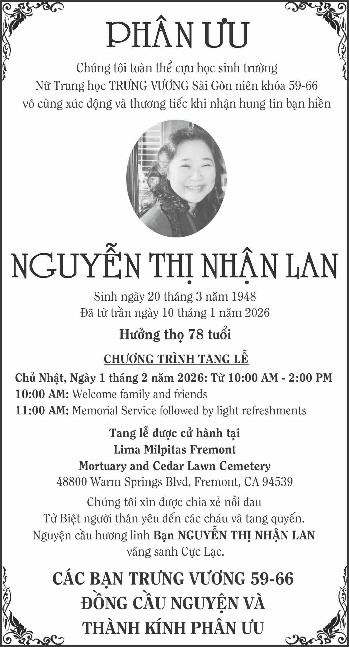 Cáo Phó - Phân ƯuPHÂN ƯU: BÀ NGUYỄN THỊ NHẬN LAN Posted on January 22, 2026 by T Nguyen T Nguyen TƯỞNG NIỆM 52 NĂM TRẬN HẢI CHIẾN HOÀNG SA 19-1-1974 | HẠM TRƯỞNG NGỤY VĂN THÀ CÙNG 74 CHIẾN SĨ HẢI QUÂN VIỆT NAM CỘNG HÒA HI SINH THƯ CÁM ƠN TỪ TÍCH LAN, ĐỢT 1/2