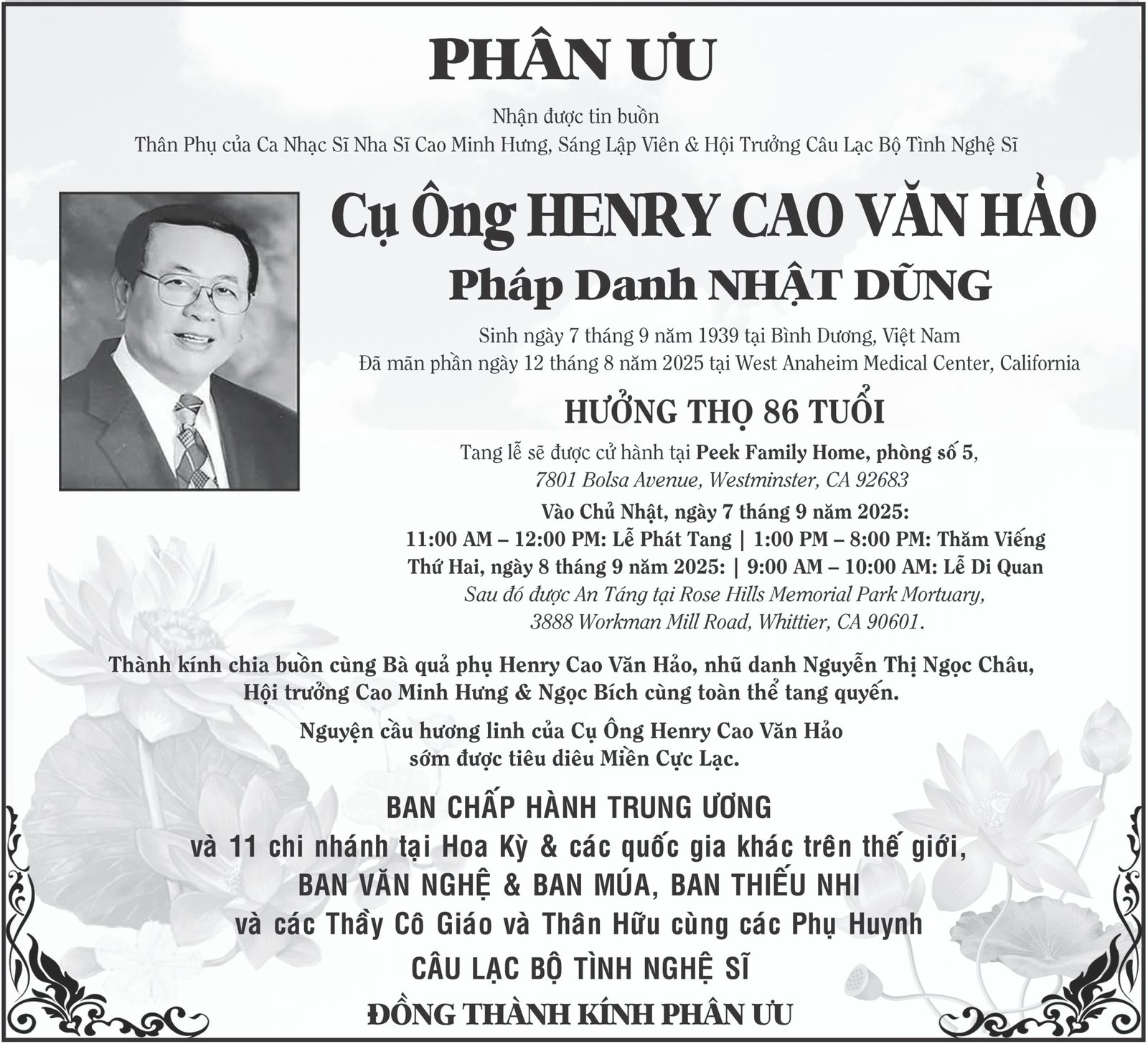 Cáo Phó - Phân ƯuPHÂN ƯU: CỤ ÔNG HENRY CAO VĂN HẢO Posted on September 5, 2025 by T Nguyen T Nguyen Hiệp hội Phát huy Công lý Người Mỹ gốc Á Nam California (AJSOCAL) đang theo dõi chặt chẽ sự đề nghị phân chia lại khu vực bầu cử đang diễn ra tại California. Tuyên bố của Giám Sát Viên Janet Nguyen về VietRise ủng hộ Chủ Nghĩa Cộng Sản