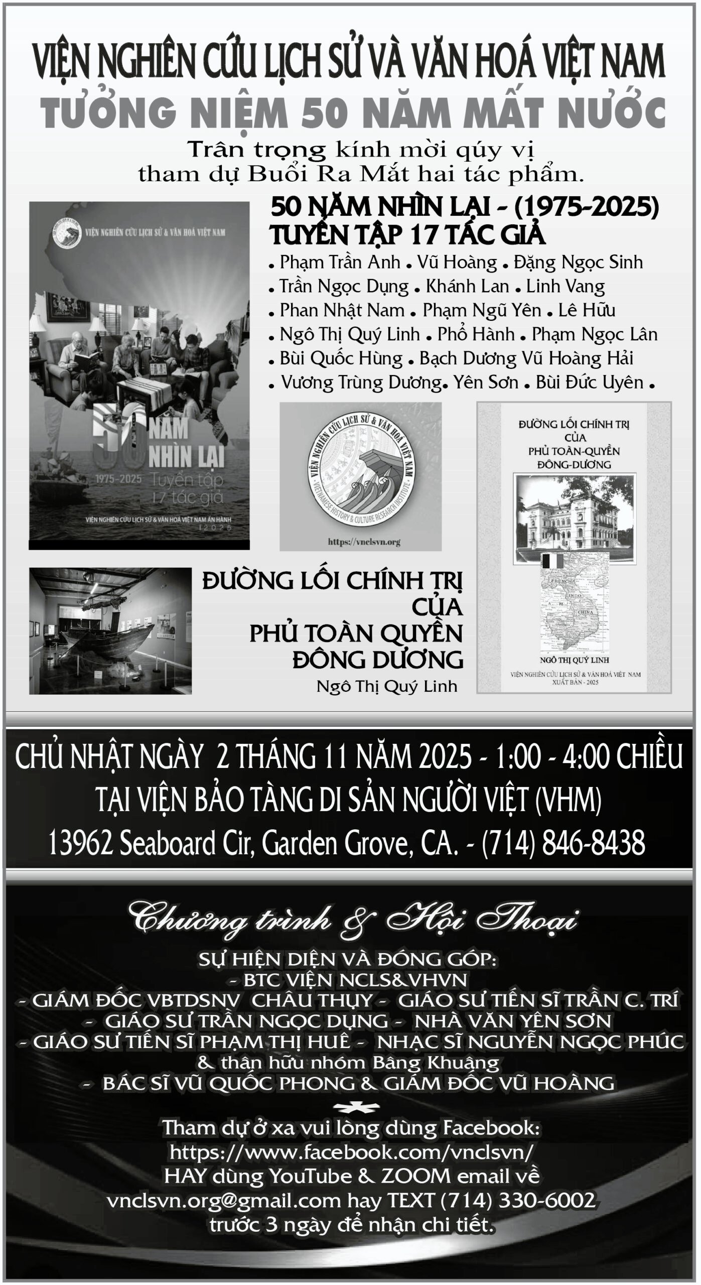 Thông Báo Cộng ĐồngTHÔNG BÁO: TƯỞNG NIỆM 50 NĂM MẤT NƯỚC Posted on October 13, 2025 by T Nguyen T Nguyen TIỆC CHAY TỔ CHỨC MỞ TRƯỜNG MẪU GIÁO