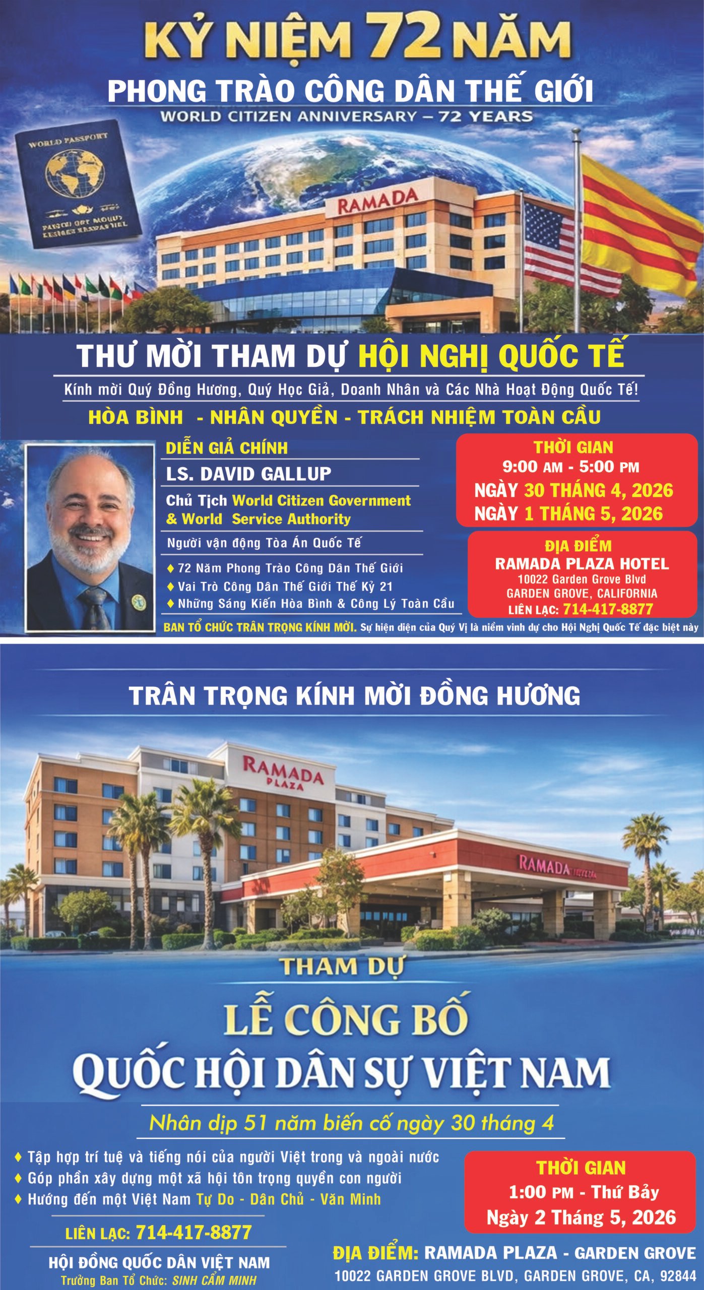 Thông Báo Cộng ĐồngTHƯ MỜI THAM DỰ HỘI NGHỊ QUỐC TẾ KỶ NIỆM 72 PHONG TRÀO CÔNG DÂN THẾ GIỚI Posted on April 20, 2026 by T Nguyen T Nguyen CÁO PHÓ: BÁC SĨ TRẦN QUÝ TRUNG